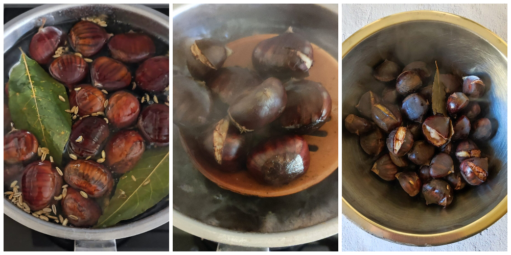 In a pot put the water with a pinch of coarse salt, the bay leaves and the anise seeds. Add the chestnuts scored with a knife and boil over medium heat for about 40 minutes.