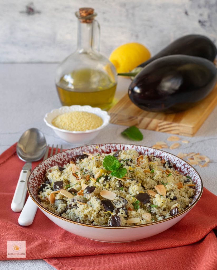 COUSCOUS WITH EGGPLANT AND MINT with lemon and crunchy almonds is a fresh, aromatic first course, perfect for warm seasons. The light, separate grains of couscous are wrapped in the full flavor of golden eggplant, which gives a soft and slightly smoky note.