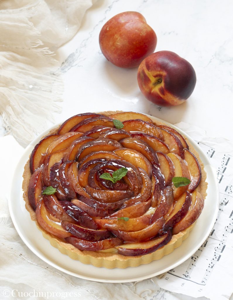 This tart, while relatively simple to make, presents a certain complexity on the palate that makes it particularly pleasant: there is a crispy shortcrust shell, a soft and delicate custard, and finally a rich crown of peaches, juicy and fresh-tasting. The combination of different textures and flavors creates the true magic of this cheerful cake.