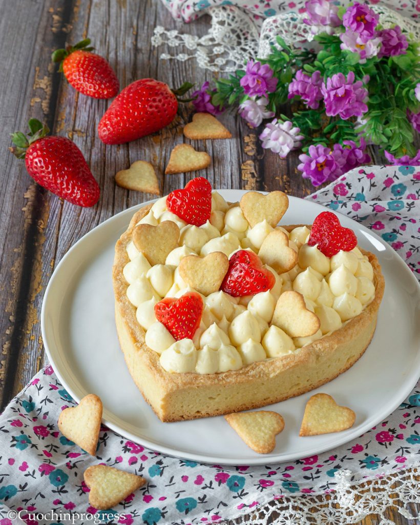 Decorate with halved strawberries shaped into hearts and the shortcrust hearts.