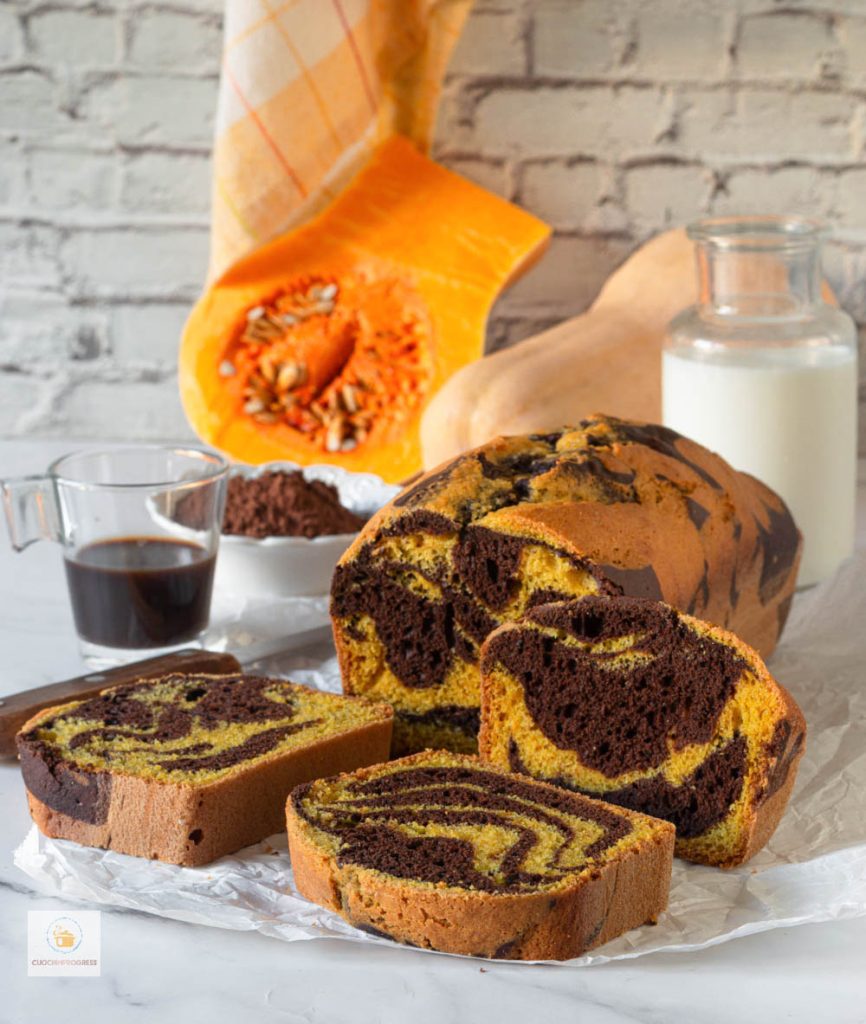 The pumpkin purée gives a velvety, light consistency, while the cocoa provides character and a warm, enveloping note. The marbled effect also makes it beautiful to see: each slice is different from the next, with golden shades and dark streaks that recall the warm tones of autumn.