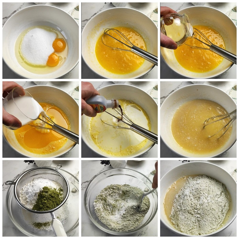 In another bowl, sift together the flour, matcha tea powder, baking powder, and salt.