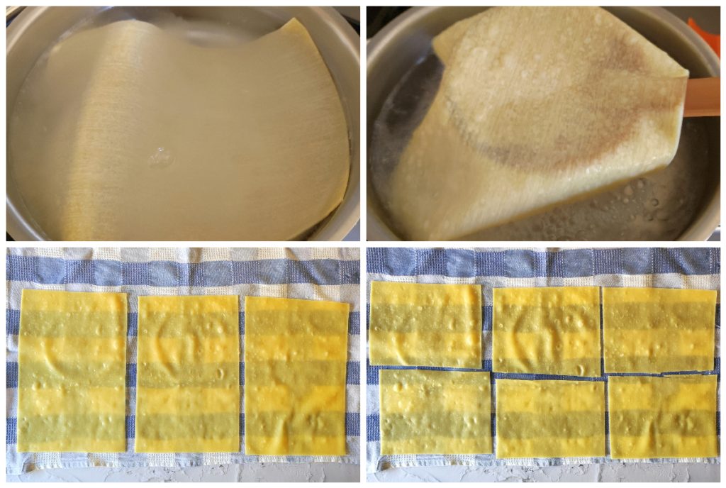 Meanwhile, bring a pot of plenty of lightly salted water to a boil. As soon as it boils, dip the lasagna sheets (use sheets that are not too thin), one at a time, and blanch them for 20 seconds.