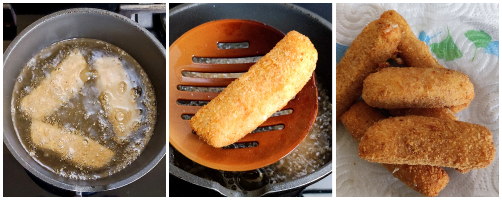 Drain them carefully without piercing them, using a slotted spoon, and as you fry place the mozzarella sticks on paper towels.