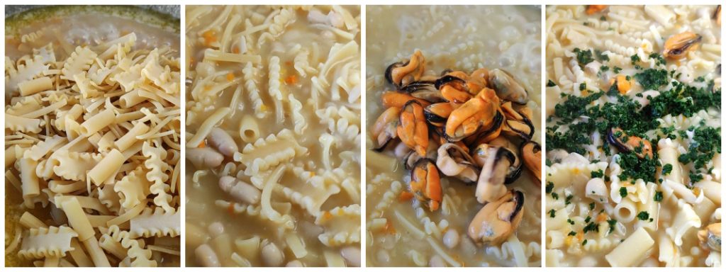 The delight of this recipe comes from the meeting of the salty, sea flavor of the mussels and the creaminess and delicacy of the cannellini beans, all enhanced and made more indulgent by a generous soffritto and a good sprinkle of pepper and parsley. As for the pasta, opinions vary: some use tubettini, cavatelli or fusilli; I chose mixed pasta — the humblest but also the most traditional. One last note: the dish is neither a soup nor a dry pasta: keep the sauce soft and creamy and success is guaranteed!