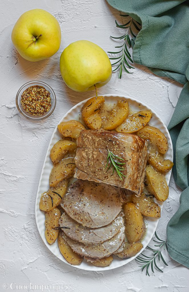 The PORK LOIN WITH APPLES AND MUSTARD is a delicate yet tasty dish, perfect to serve as a main course even at a lunch with guests, given the goodness and the refined, distinctive flavor of this preparation. It’s also ideal when you have many guests, since this cut of pork is particularly economical and it’s certainly not inappropriate to keep an eye on the wallet even when cooking well.