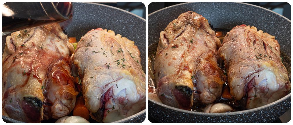 Cover with a lid, turn the meat from time to time, and let the shanks simmer on low heat for at least 2 hours.