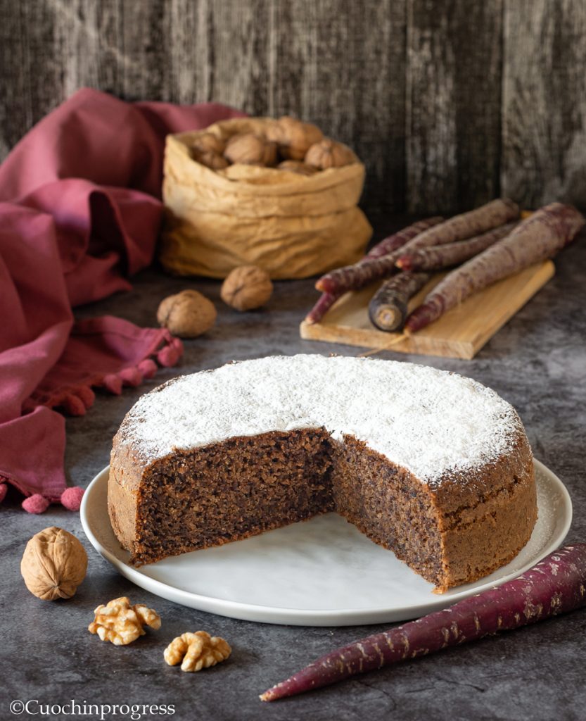 The PURPLE CARROT AND WALNUT CAKE is a rustic, very soft, fragrant dessert with a slightly moist interior and absolutely delicious. It’s perfect to enjoy in the morning for breakfast, as an afternoon snack with a cup of hot tea, or even as an after-meal dessert, perhaps accompanied by cinnamon-flavored whipped cream or a sweet cream cheese frosting (to mimic our friends across the ocean).