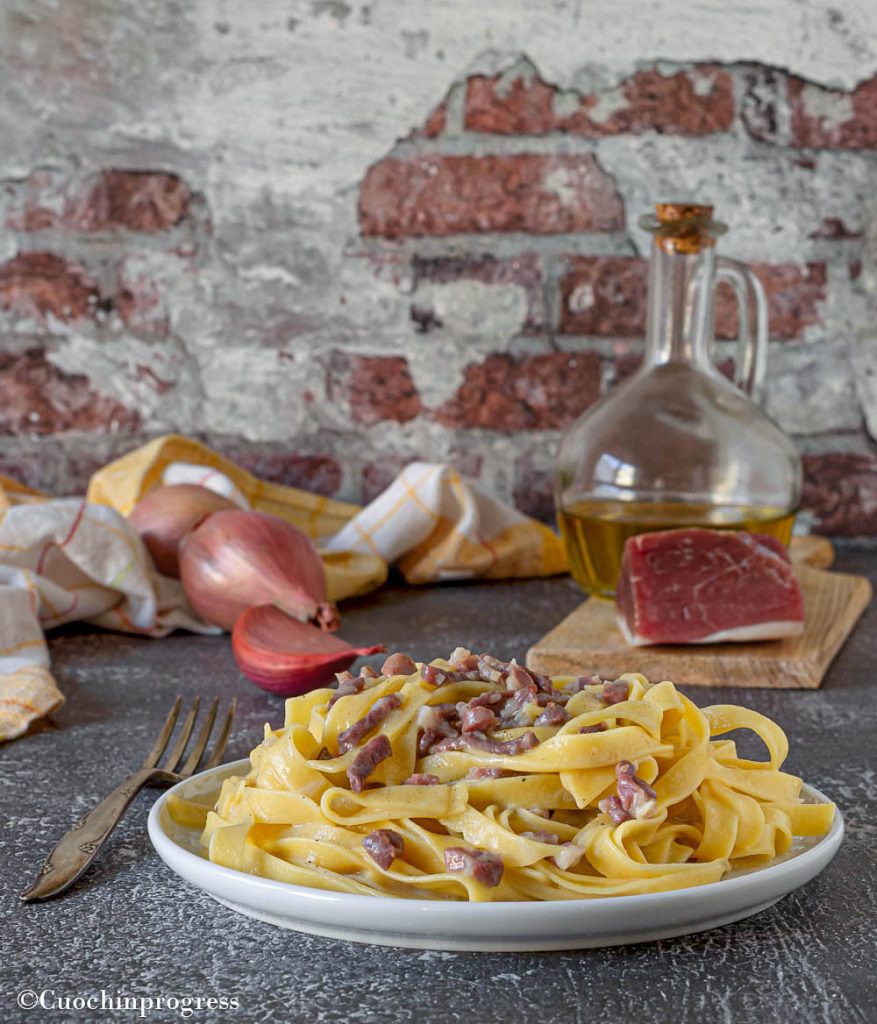 The dish’s key ingredient is the base of cured prosciutto, usually the classic heel (gambuccio), which is cut into fairly small pieces, much like a meat ragù. The saltiness and richness of the prosciutto are softened by the sweetness of the shallot, which in this recipe is exactly in its place. What really makes the dish succeed, however, is perfectly cooked tagliatelle and finishing them in the pan together with all the ingredients, a little cooking water and a well-aged Parmigiano. This way the tagliatelle will be well coated and enveloped by the sauce, without adding cream or other fats that would only spoil the harmony of flavors.