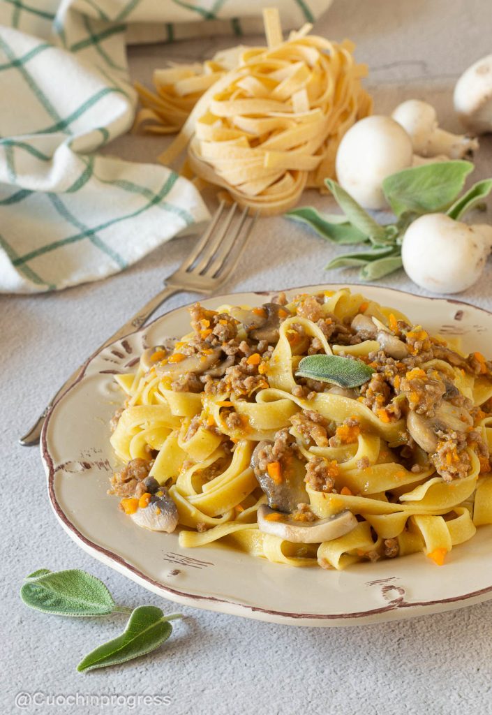 Preparation of tagliatelle with white ragù and mushrooms