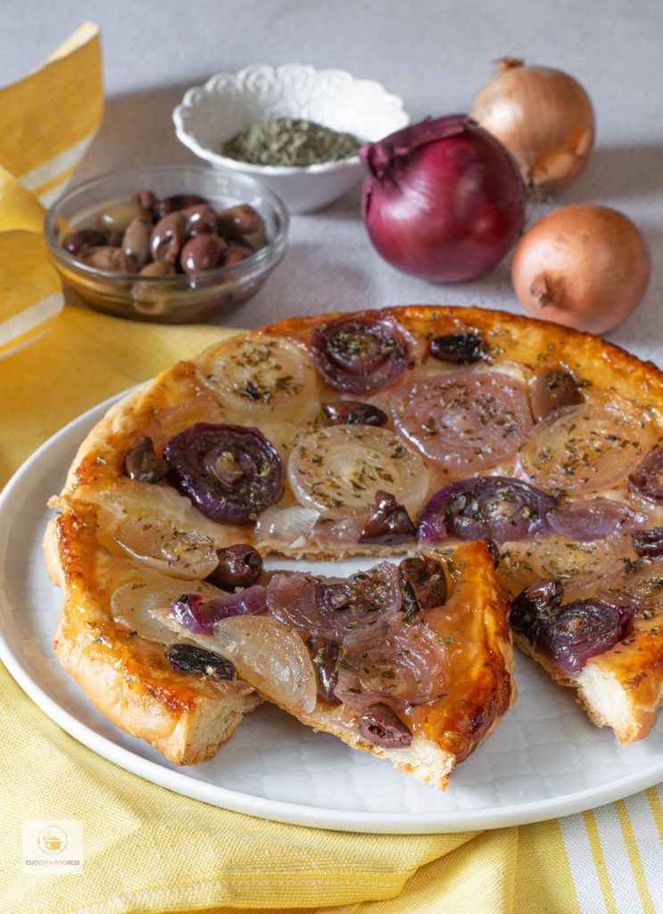 The TARTE TATIN WITH ONIONS AND OLIVES is one of those recipes that can turn simple ingredients into a surprisingly elegant dish. A golden puff pastry shell encloses a soft, caramelized filling where the onions almost melt into a creamy texture and intertwine with the savory notes of the olives, creating a perfect balance between sweetness and character.
