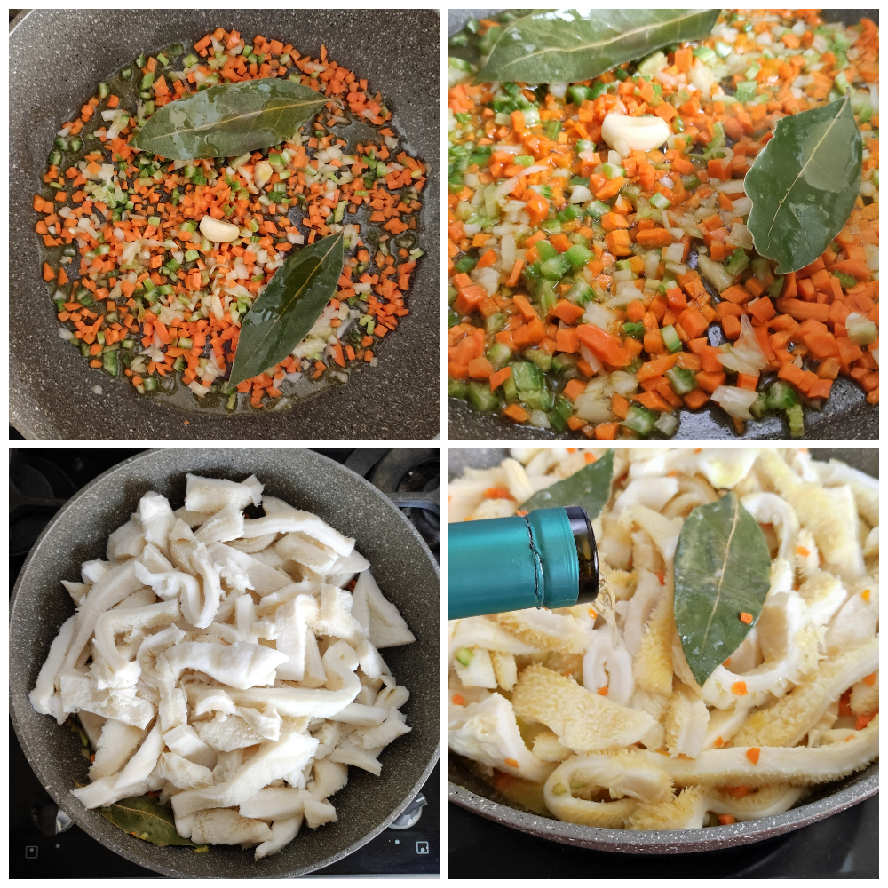 Slice the tripe into strips not too thin, wash it very well under running water and drain it. In a pot, preferably earthenware, sauté the finely chopped aromatics, the garlic and the bay leaves. Add the tripe, brown it for a few minutes, then deglaze with the white wine and let it evaporate.