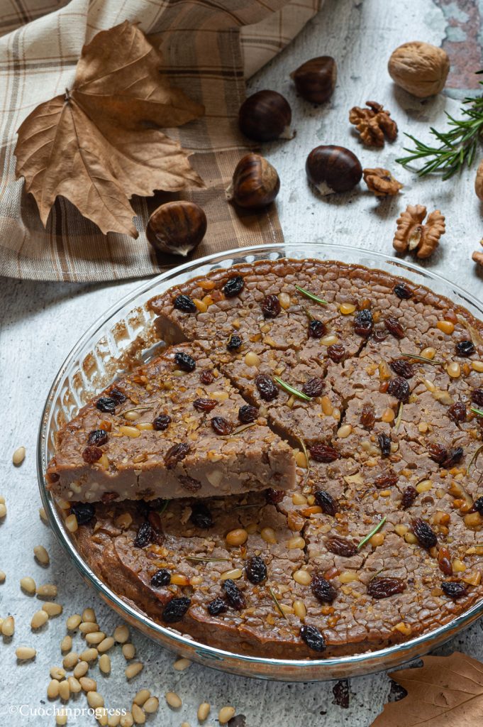 • Bake the castagnaccio in a preheated conventional/static oven at 428°F for 30 minutes. It will be ready when the surface shows cracks and the fruit is golden. Remove the castagnaccio from the oven and let it cool completely, then slice and serve.
