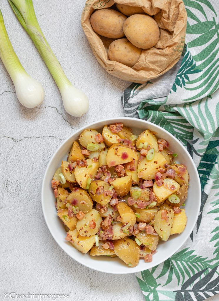 There are few ingredients, as you have seen, but new potatoes, spring onions and pancetta combine wonderfully, especially thanks to the sweet-and-sour dressing made with Dijon mustard, apple cider vinegar and sugar (or honey, if you prefer), which gives flavor and freshness, as you can taste. Naturally, feel free to choose how much mustard to add, which will also give the dish a slightly spicy note if you like.