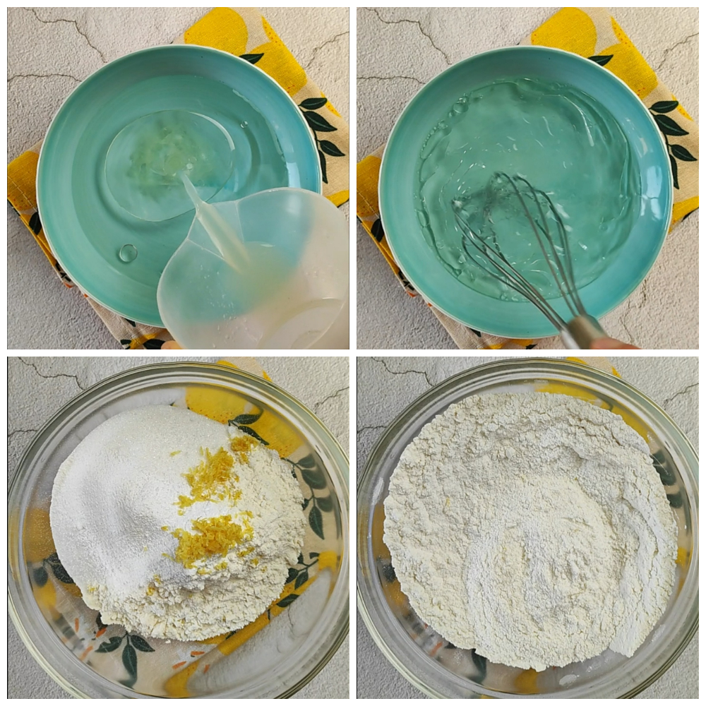 Meanwhile, in a bowl mix the water with the oil and the lemon juice. In another bowl, pour the dry ingredients—sift the flour and baking powder—add the sugar, the grated zest of one lemon and mix.