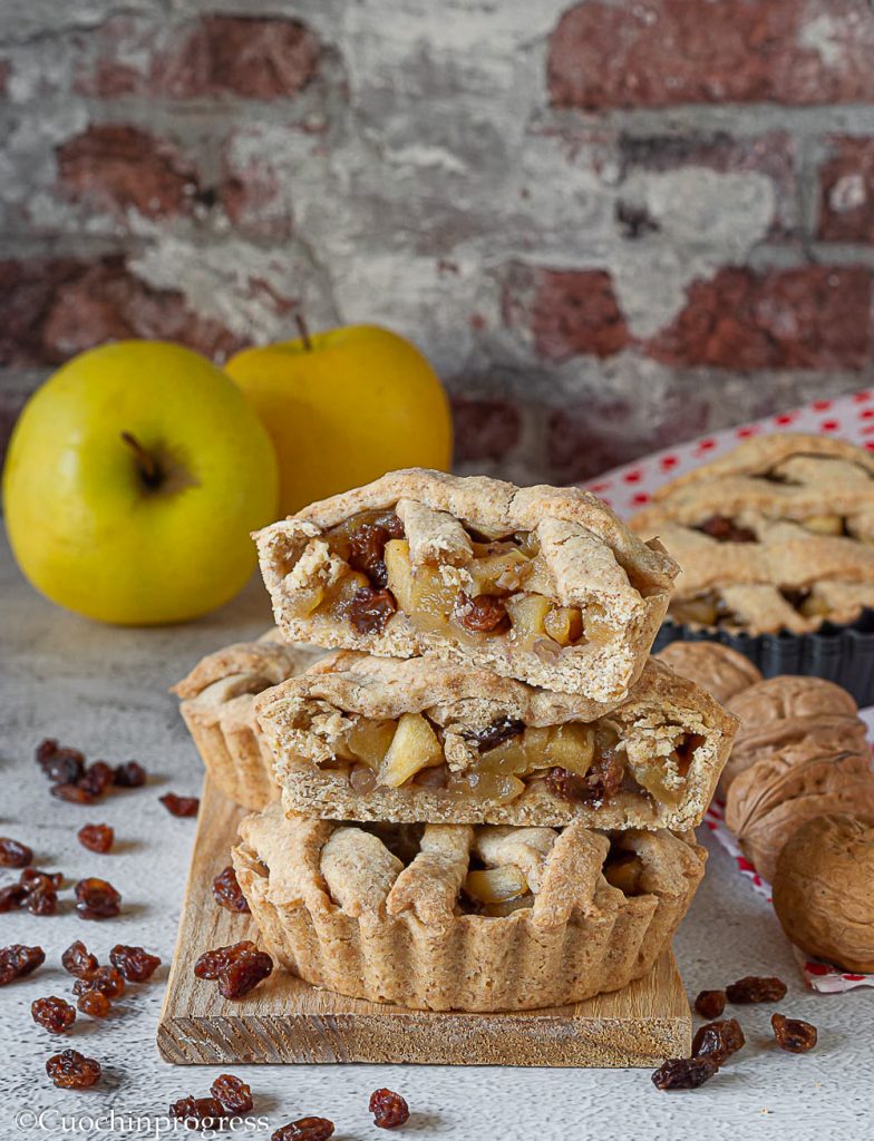 These tartlets contain, inside a delightful whole-wheat shortcrust pastry, a filling of apples, raisins and walnuts, skillfully flavored with lemon juice, brown sugar and cinnamon. During baking the flavors marry perfectly and the result is a fragrant yet soft, rich but fresh dessert thanks to the crisp apples. In short, a real symphony of flavors and textures that balance one another.