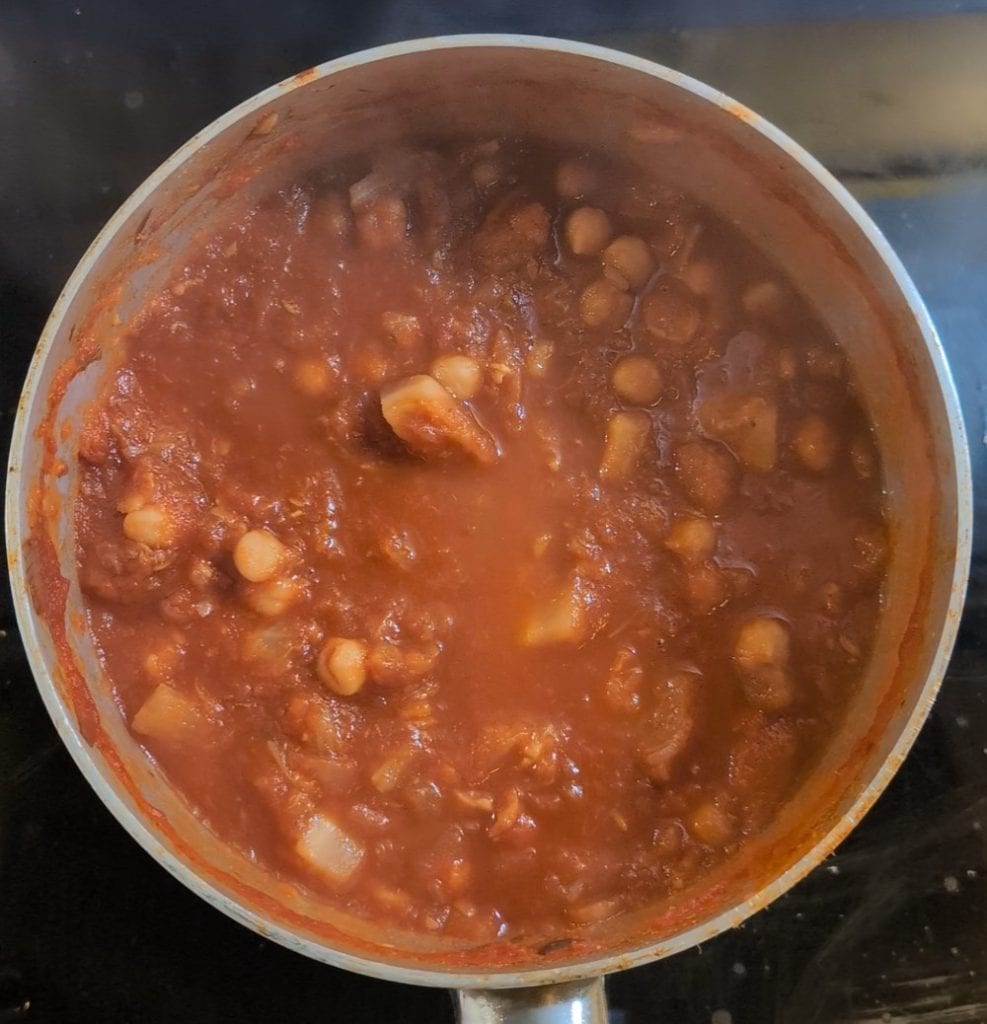 When the tomato sauce has thickened, add the cooked chickpeas and let them cook over low heat for another 20 minutes, or until the caciucco has reached the desired consistency.