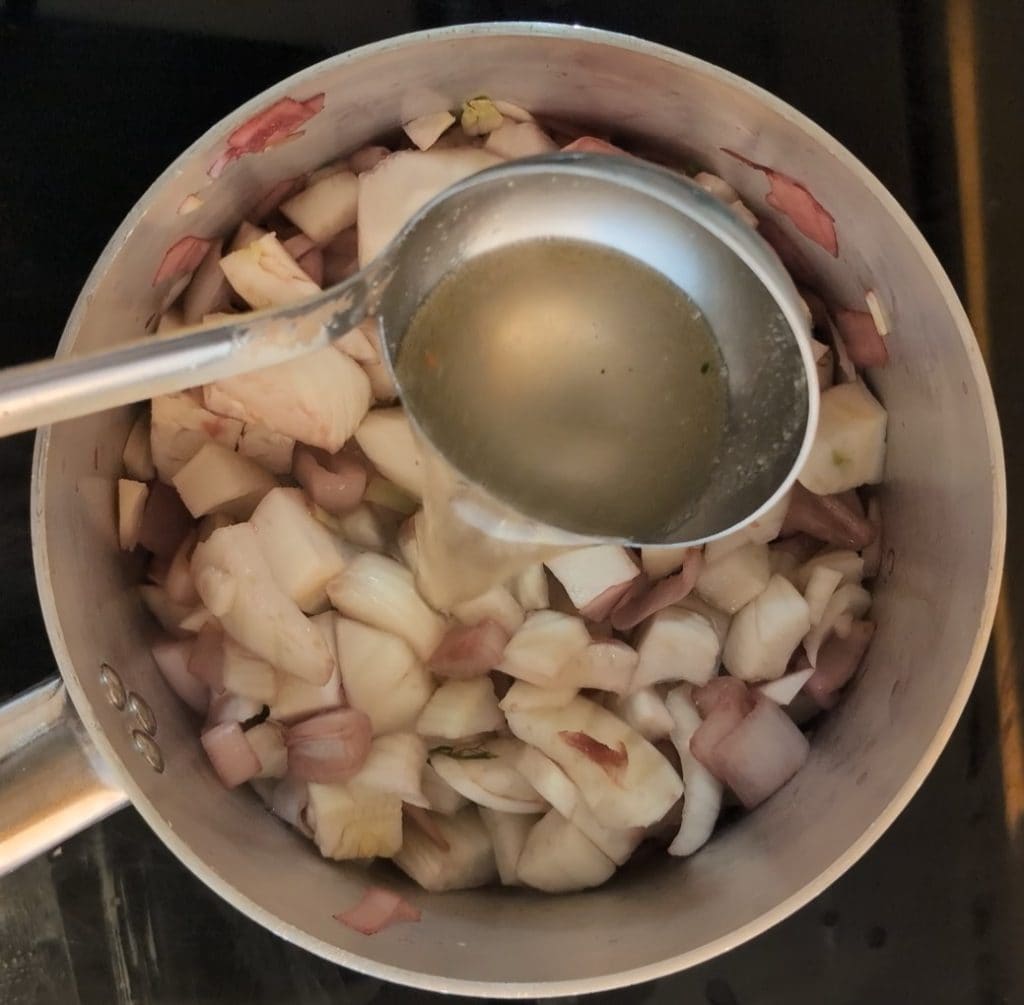 • To prevent the vegetables from sticking and burning at the bottom of the pot, after browning the onion and garlic, we add the chopped fennel and half a ladle of hot broth.