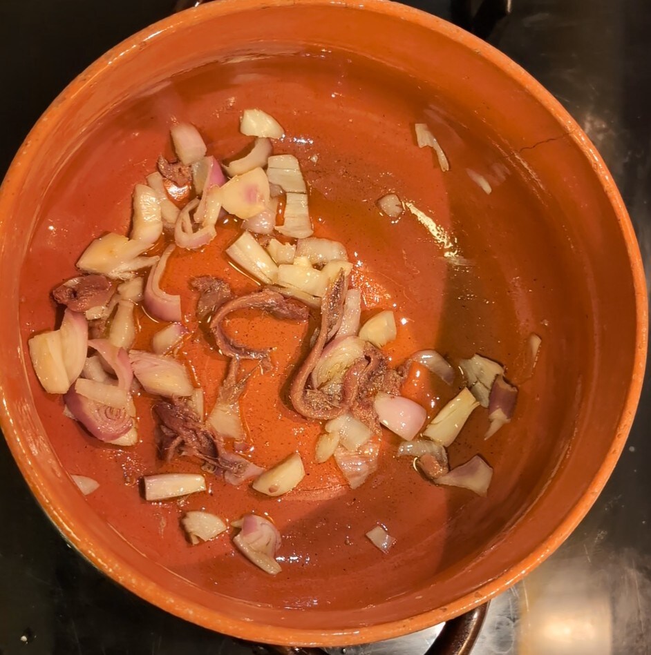 • To make the chickpea caciucco, first of all, I made a sauté with a tablespoon of extra virgin olive oil, an anchovy, and a shallot.
