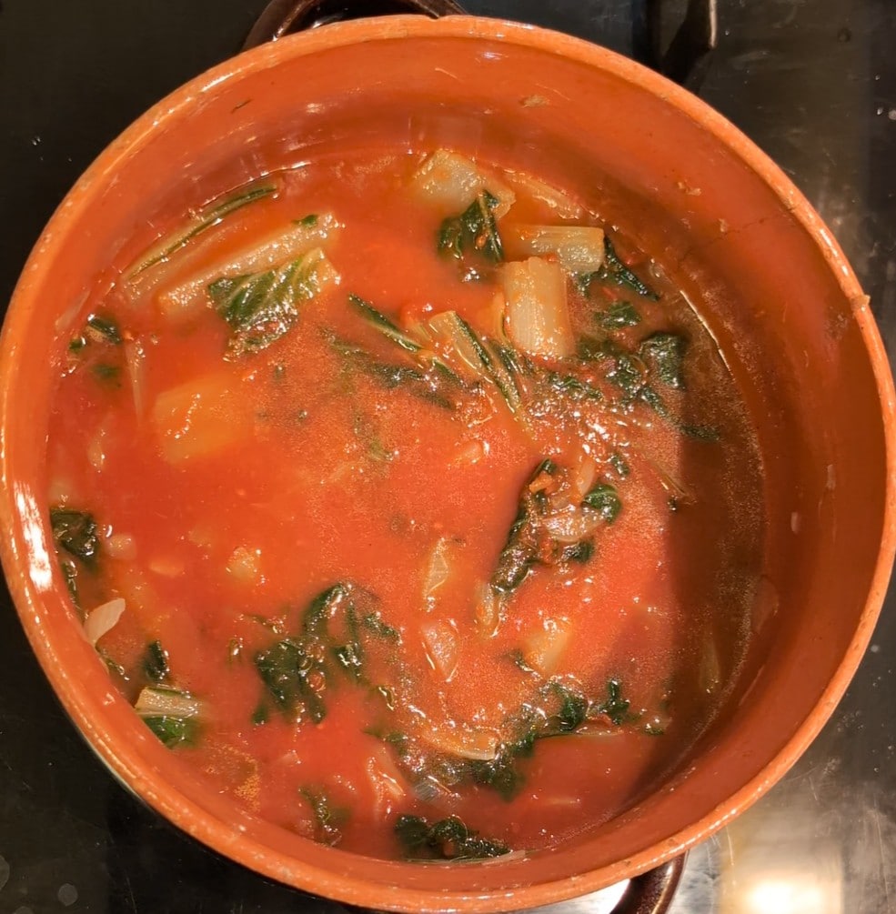 • Subsequently, after blanching the Swiss chard with the sauté, I added the peeled tomatoes and without adding any other liquid, I cooked it for another 10 minutes to reduce it a bit.