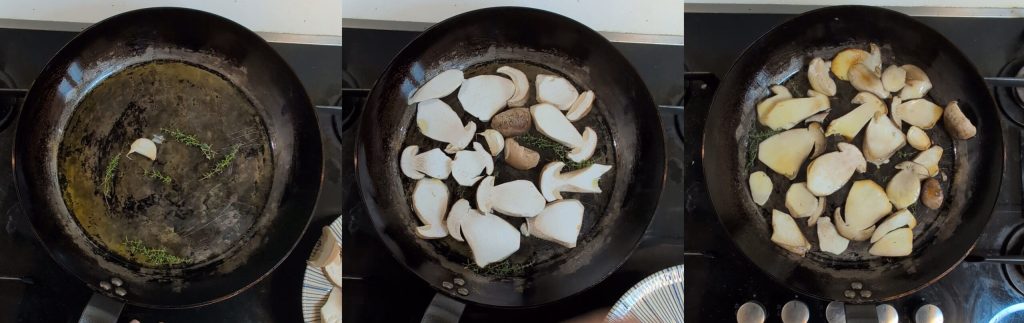 It’s time to bring the heart of our dish to life: the porcini mushroom sauce. We heat a non-stick pan, preferably iron for quick and even cooking, and add a drizzle of extra virgin olive oil. Add a whole garlic clove, which will release its aroma without burning, and a few sprigs of fresh thyme for a fragrant touch.