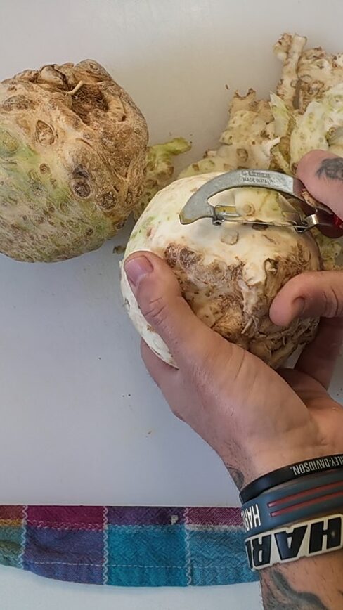 Carefully peel the celeriac, removing all the hard parts and roots.