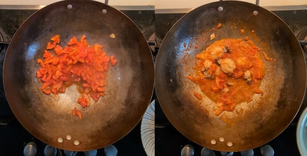 Once the thawing water has evaporated, I add the shelled mussels and shrimp. To preserve their delicacy, I cook them briefly. At this point, I deglaze with fish broth, and if desired, add a sprinkle of chili and a pinch of saffron for an even more intense flavor and let it all absorb flavors for just a moment.