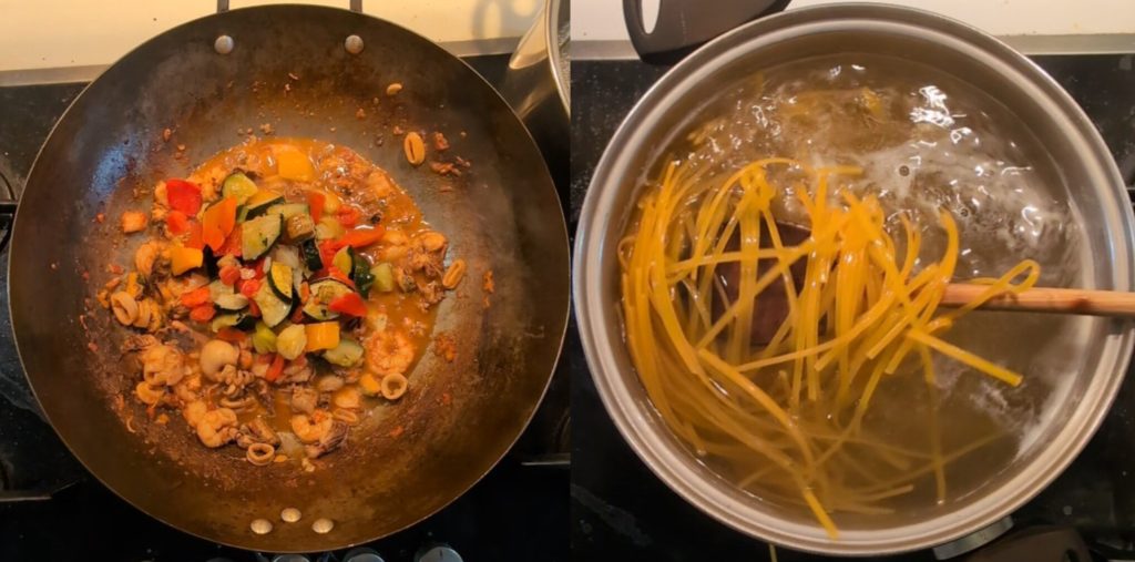 While the pasta cooks, transform your seafood sauce into a triumph of Mediterranean flavors: add diced zucchini, peppers, and eggplant, sautéing them in the pan until tender. For an extra touch, I chose saffron spaghetti for a truly special pairing.