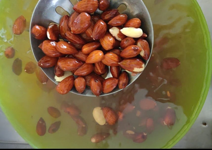 Now drain the almonds in cold water (even running water is fine) and let them cool completely.