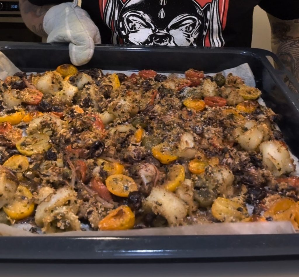 Now that you have combined the chopped spices and olives with the squid and marinated cherry tomatoes, it’s time to bake everything to create a truly irresistible dish!