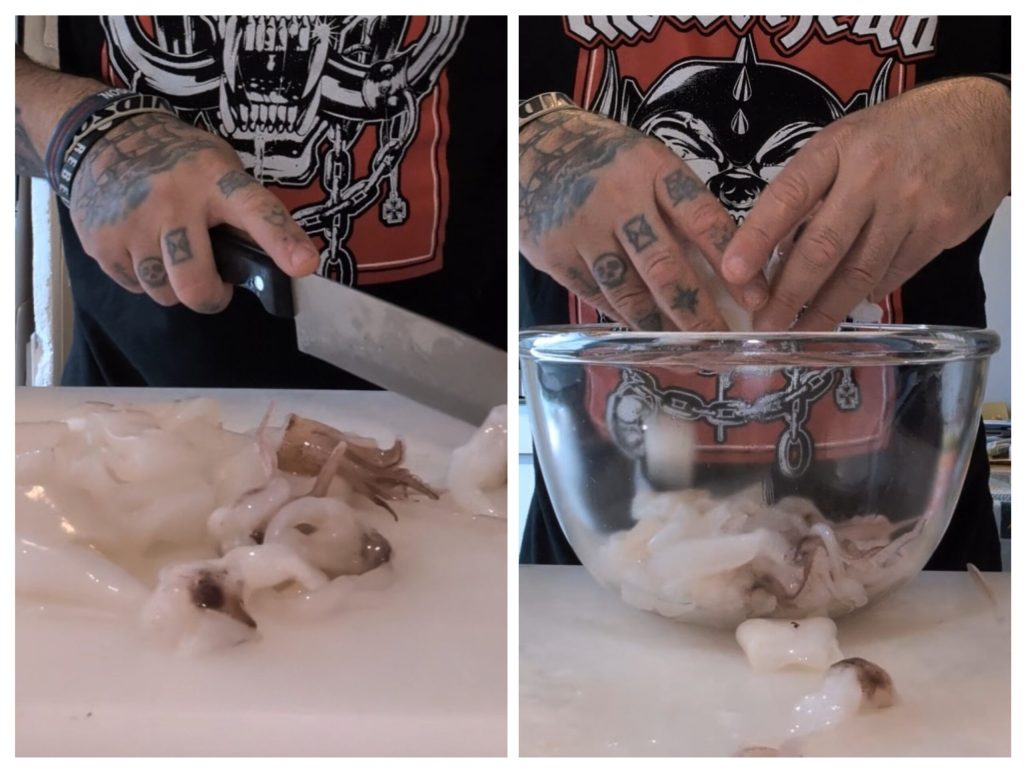 Soon after, add the chopped spices and olives to the squid rings and marinated cherry tomatoes.