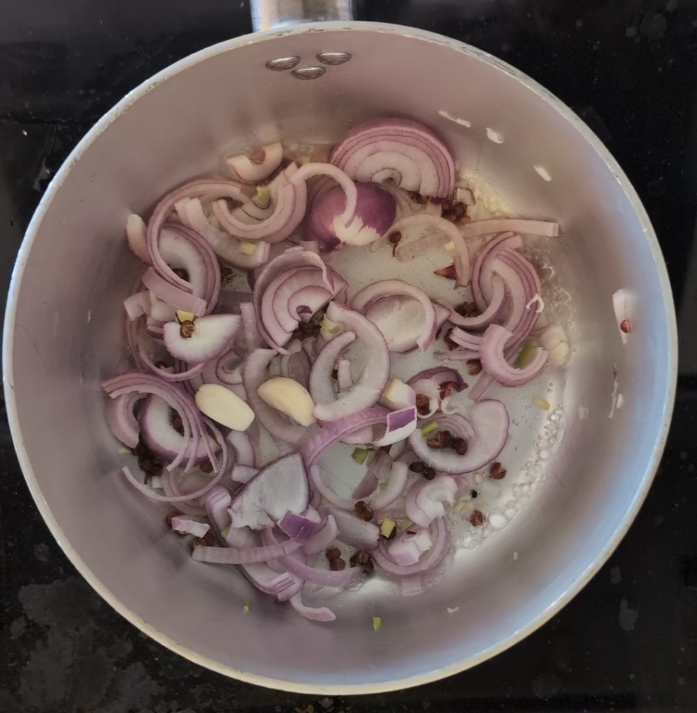 To prepare the mixed legume soup, sauté the garlic, onion, and pepper in a high-sided pot with half a glass of water and a teaspoon of vinegar. This way, the aromas of the vegetables are preserved without the need to fry, reducing calorie intake. For a personal touch, I added a pinch of Sichuan pepper, but you can use any pepper you like.