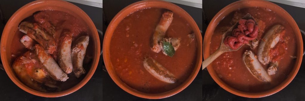 To start the Neapolitan ragù, brown the mixed meat cut into pieces and the pork sausage in a skillet until golden on all sides. If you use an iron skillet, you’ll get a more intense flavor. Set the meat aside and proceed with the preparation of the tomato sauce. My grandmother always added a pinch of chili pepper to her ragù to make it spicier, if you like spicy you can try it too!