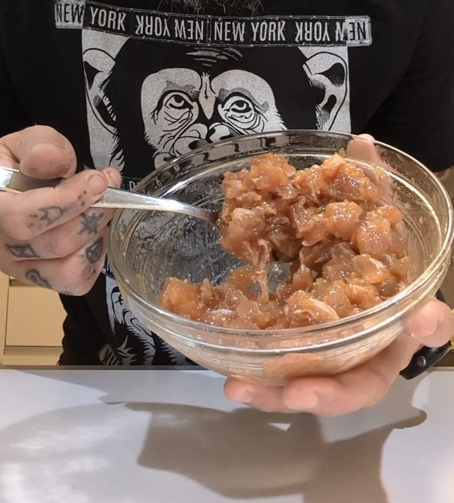 Now, while we wait for the pasta to cook, let’s prepare the tuna tartare, as it needs to marinate for at least 15 minutes, the same time required for the pasta to cook. Of course, you can also prepare it before starting to cook the pasta. The choice is yours. I marinated it only with Worcestershire sauce and Maldon salt flakes.
