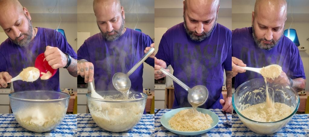 Drain the pastina leaving a bit of cooking broth, then pour it into a container that’s large enough.