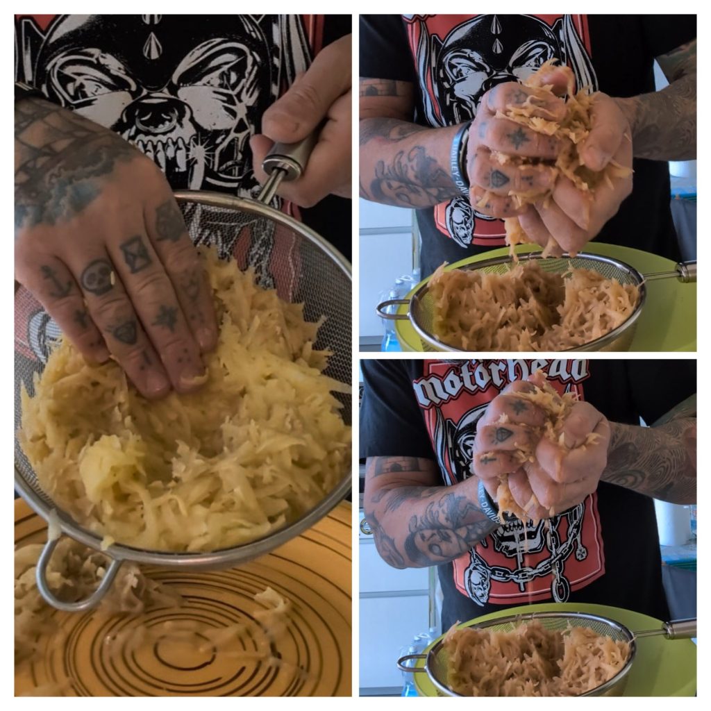 Start by washing the potatoes thoroughly, and peel them with a potato peeler to remove the outer skin. Coarsely grate the potatoes using a large-hole vegetable grater. This step will give your Rösti the right texture. To remove excess water, place the grated potatoes in a colander and let them rest for about 30 minutes. This way, the water will separate from the potatoes, making it easier to work the dough and ensuring even cooking. After the resting time, it is time to wring out the potatoes. You can do this with force using your hands or a clean cloth. The goal is to eliminate as much water as possible, obtaining a compact and dry dough.