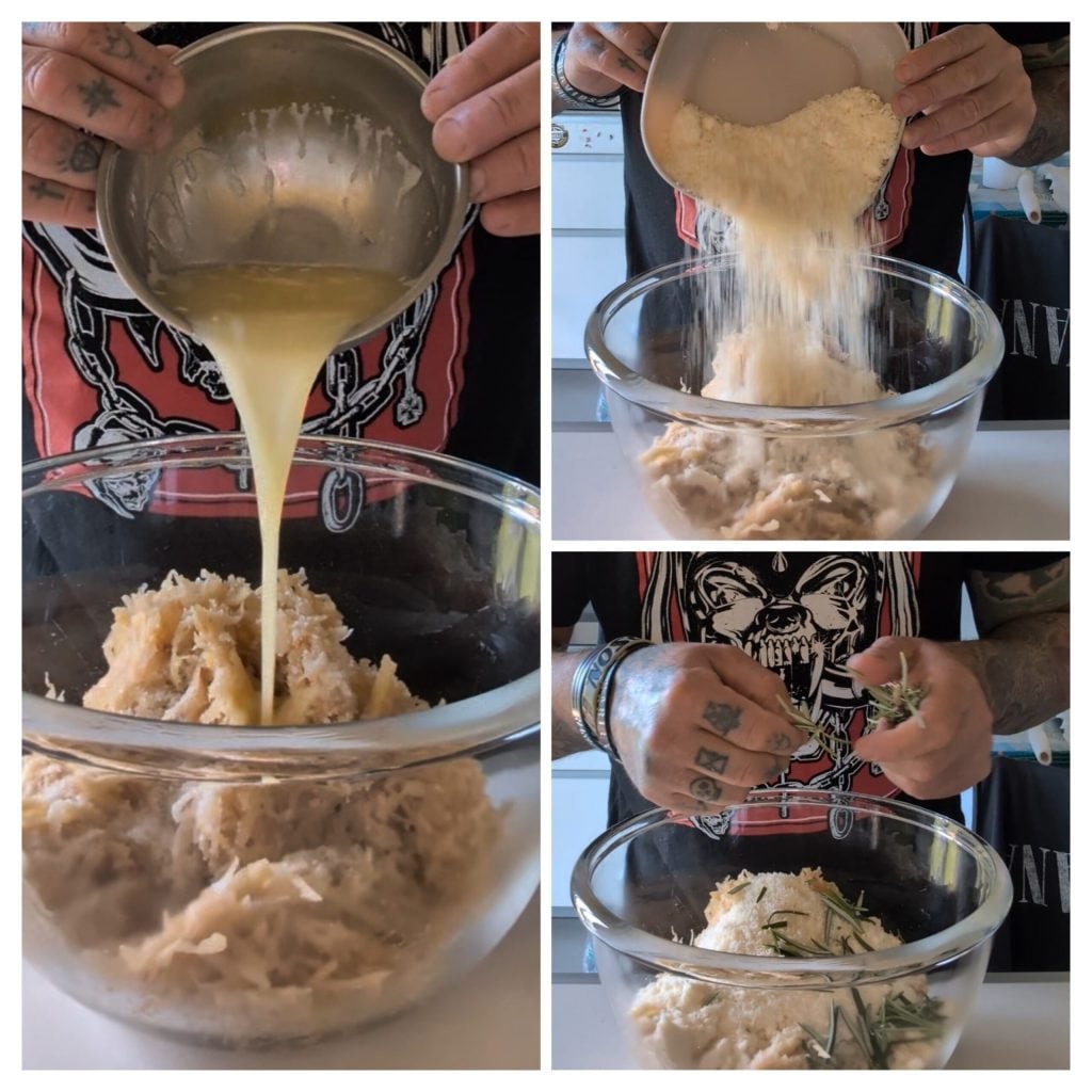 Once your grated potatoes are well dried, transfer them to a large container and start adding the other ingredients to create a rich and flavorful dough that will form the base of your Potato Rösti. Start with a knob of melted butter, adjusting the amount according to your tastes and the desired consistency for the Rösti: if you prefer a softer dough, add another spoonful. Incorporate the grated cheese, choosing between Grana Padano, Parmigiano Reggiano, or Pecorino according to your preferences. The cheese will give your Rösti a strong taste and an irresistible aroma that will conquer your palate. Add a pinch of chopped rosemary, the amount you prefer, to give the dish a fresh and Mediterranean note that will make it even more special. Season with salt and pepper, adjusting the amount according to your tastes and the type of cheese used. Grate the pepper fresh for a more intense and aromatic flavor that will enhance the dish’s flavors.