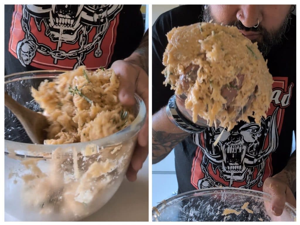 Mix all the ingredients well, first with a spoon to incorporate them evenly, and then with your hands to compact the dough. Work the dough energetically until you obtain a homogeneous and compact mixture, similar to shortcrust pastry. If necessary, add another spoonful of melted butter or a pinch of breadcrumbs to adjust the dough’s consistency. The reference point is to obtain a dough that feels almost sticky to the hands, but still workable and not excessively soft.