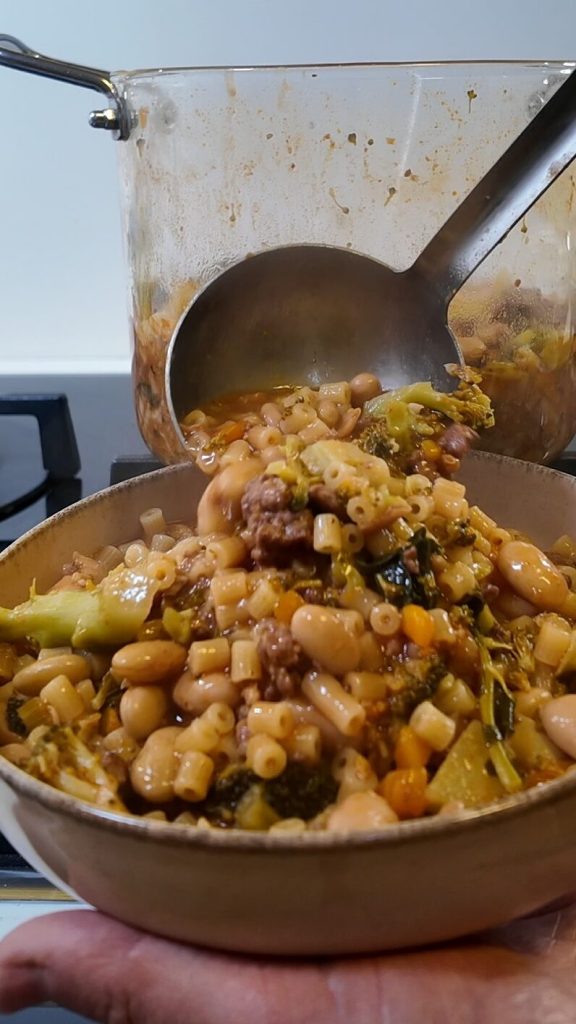 Creamy: If you want a thicker broth, you can take a ladle of cooked beans and blend them with an immersion blender, reintroducing the puree into the soup before adding the pasta.
