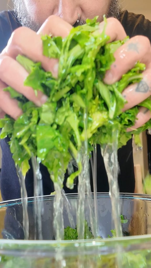 Grandma Maria taught us not to waste anything but to choose carefully: discard the toughest stems and yellow leaves.