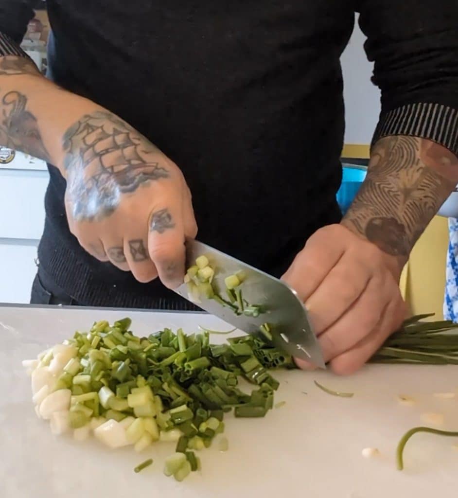 Similarly, finely chop the spring onion. We won’t use it yet, but it will be needed at the end of cooking to flavor the dish and garnish it with a touch of color and crunch.