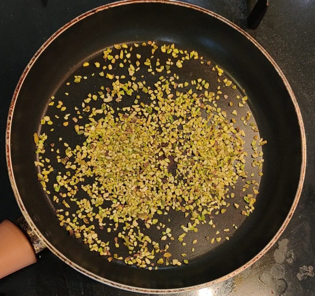 • To make spaghetti with mortadella and truffle pistachio pesto, first of all I toasted the chopped pistachios that will be used at the end of the recipe.