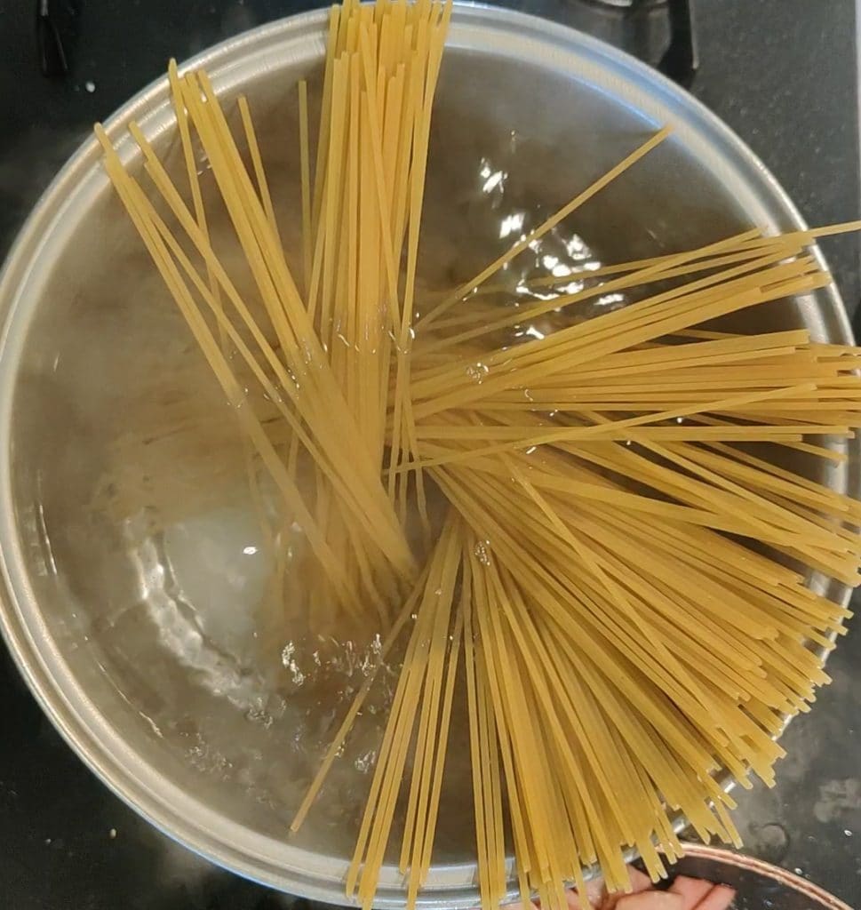 • Then another thing to do right before dealing with the rest of the recipe is to put the spaghetti to cook in boiling salted water.