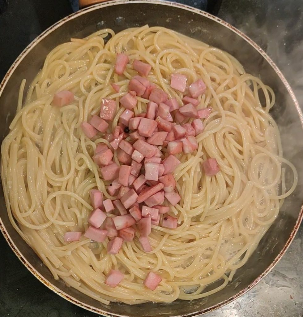 • To conclude drain the spaghetti very al dente and finish cooking them by tossing them in the pan where the mortadella was cooked.
