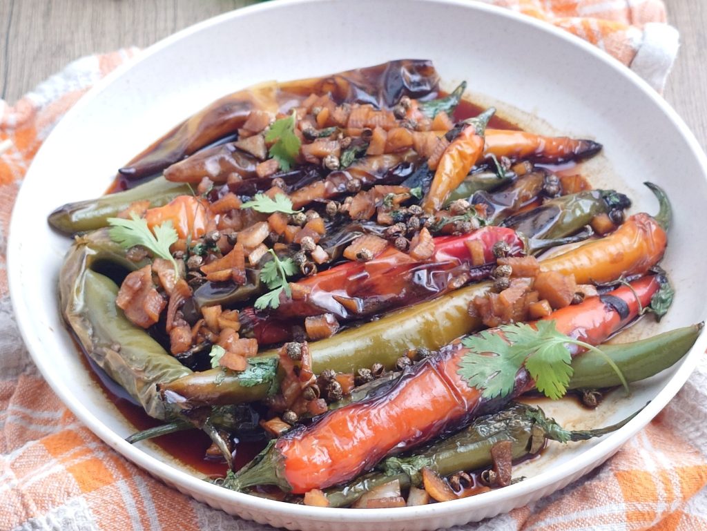 “Tiger Skin” (Hǔpí) is a Chinese term that describes the final appearance of the peppers.