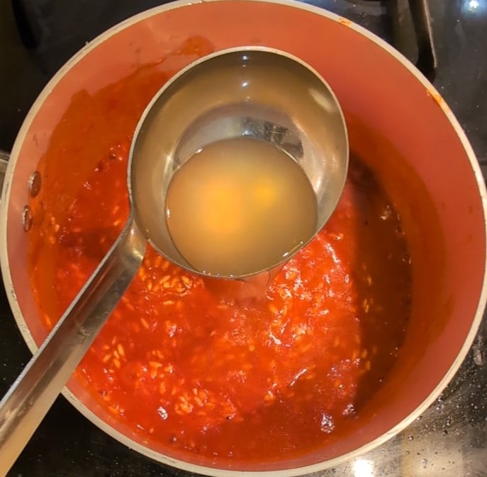 Now, as we are all accustomed, we add the vegetable broth one ladle at a time, stirring continuously. It is important to let it simmer gently, stirring often to prevent tomato splashes all over the kitchen.