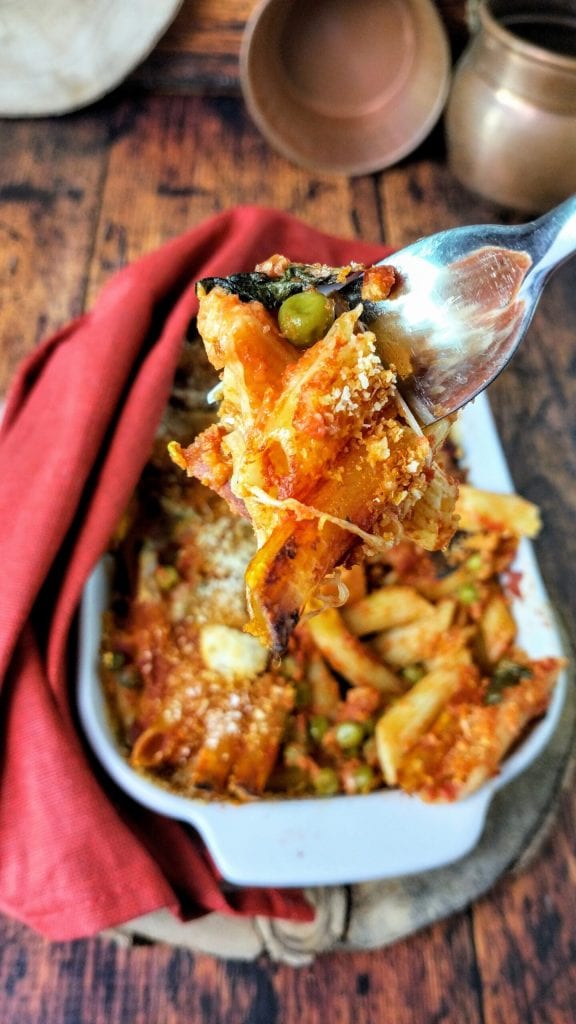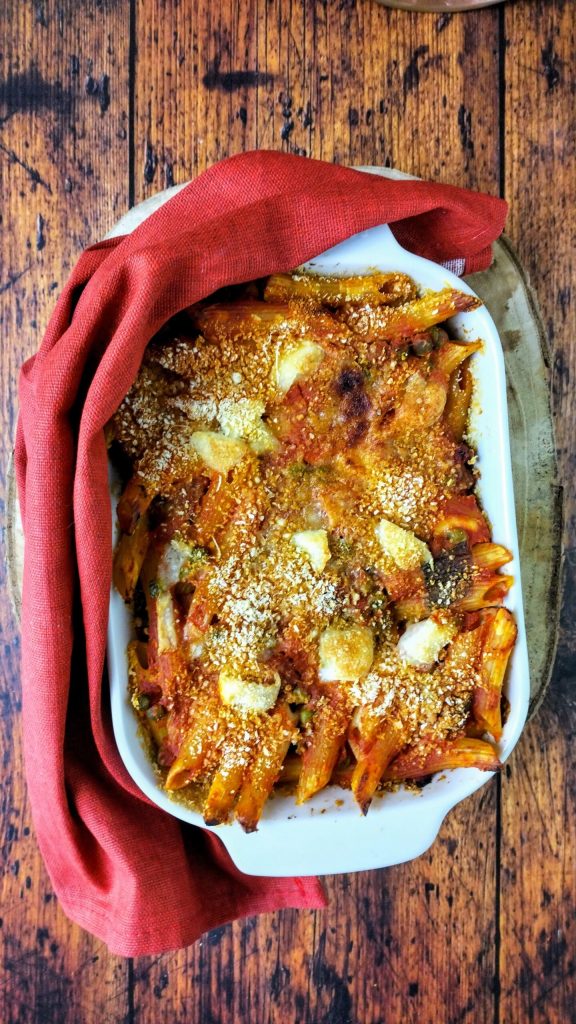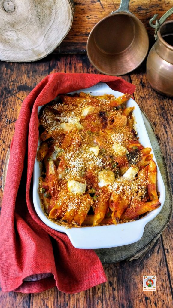 The baked pasta can be stored in the fridge for 1-2 days, covered with aluminum foil. Before enjoying it, reheat it in the oven at 320°F for about ten minutes.