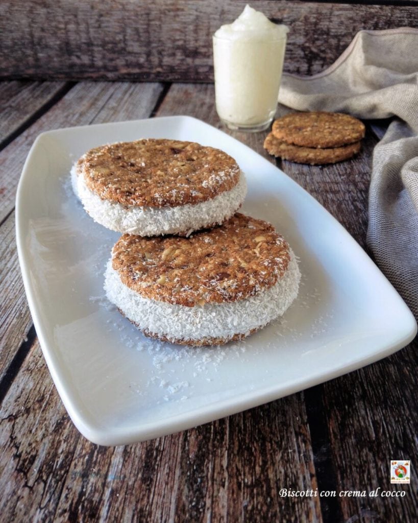 Two fragrant cookies enclose a delicious coconut cream, without milk and without eggs. In fact, this fantastic filling is made with coconut flour, cornstarch, sugar, and water. A very simple and light cream, ideal for your summer desserts, and ready in a few minutes.