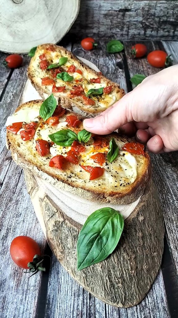 These crostini are a celebration of genuineness. They use fresh and quality ingredients: slices of crunchy homemade bread, creamy mozzarella, and juicy cherry tomatoes cut into cubes, seasoned with extra virgin olive oil, salt, and oregano. Everything is baked, creating a mix of flavors and aromas that will make your mouth water.