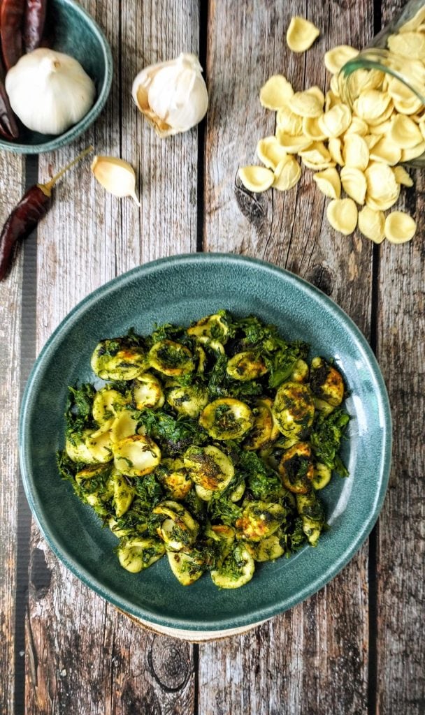 Short and ridged pasta, like orecchiette or rigatoni, is ideal because they hold the sauce better.